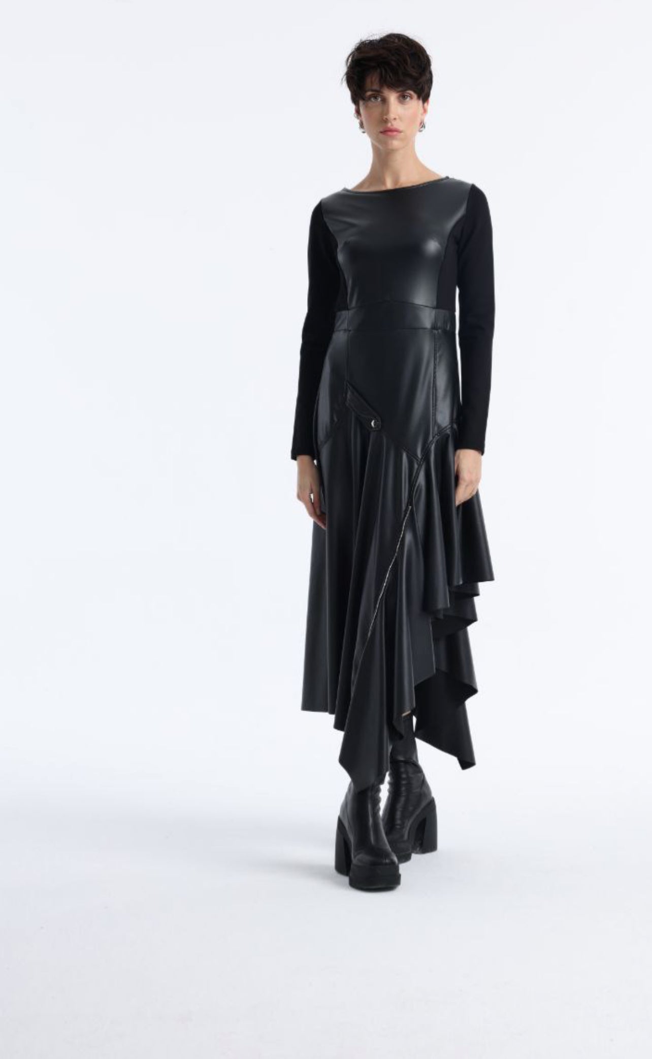 The Raven Asymmetry is a leather dress designed for contemporary evening wear.Crafted from high-quality faux leather with a fitted bodice and long sleeves. The asymmetric hemline features cascading ruffles that create movement and visual drama.The high-low silhouette is finished with a back zipper closure and side pocket detailing. The structured bodice contrasts with the fluid, layered skirt.Designed for evening events, gallery openings, or occasions that call for sculptural elegance.Made in Turkey.