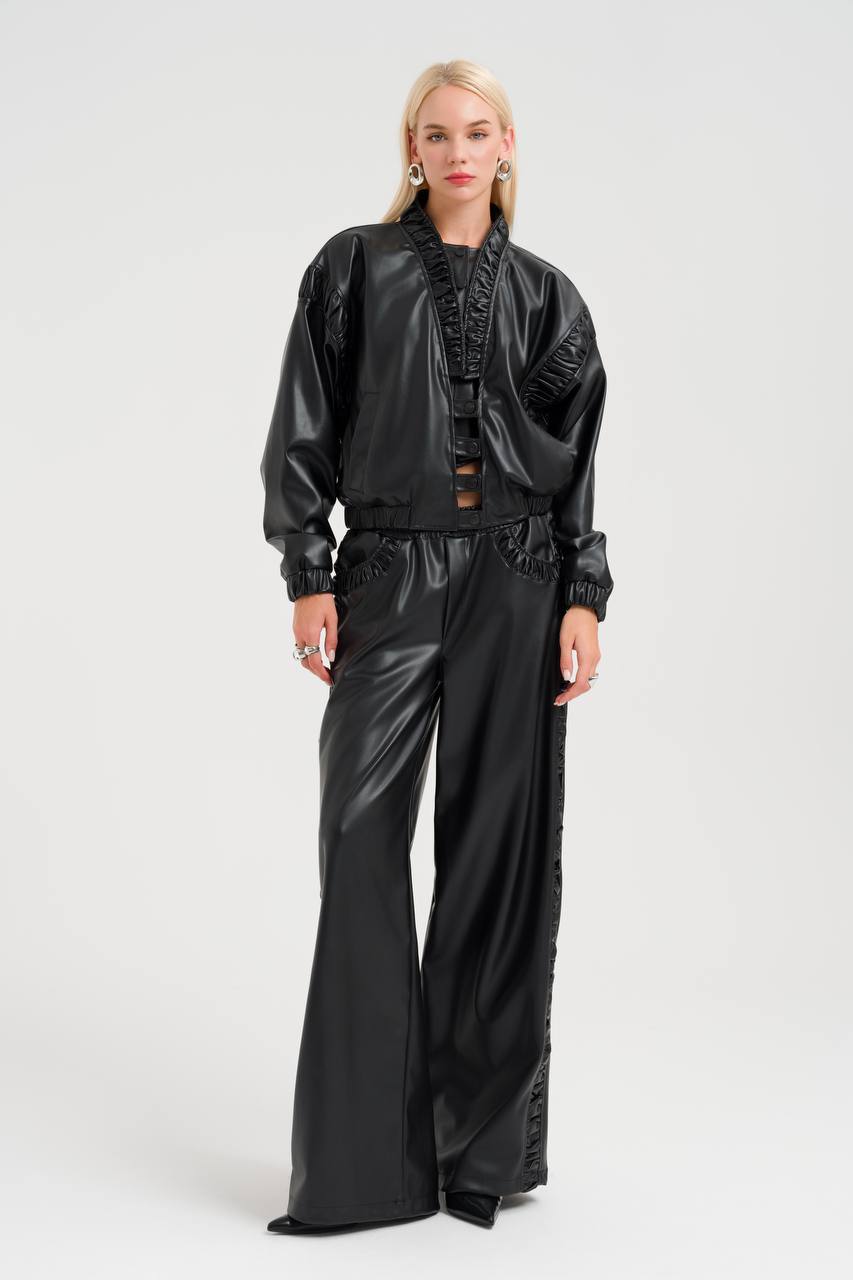 Nocturne Luxe Set – Tashelion Midnight confidence. The Nocturne Luxe Set merges architectural design with luxurious fluidity. Crafted from soft black vegan leather, this two-piece ensemble pairs the voluminous luxe jacket with matching wide-leg pants, creating a silhouette that radiates power and precision. Every texture — from the smooth finish to the gathered edges — tells a story of quiet strength and bold intention. For the woman who turns presence into art. Details Two-piece ensemble: Nocturne Ruch Jacket + Pants Soft luxe detailing throughout Elastic waistband for flexibility Fully lined, breathable interior Composition: PU leather blend Styling Tip: Complete with silver jewelry and sleek heels for the ultimate Tashelion monochrome statement.
