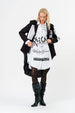 The Word Smith Blazer Set Statement-making tailoring with a poetic edge. This two-piece set merges intellectual rebellion with modern tailoring. The sharp-cut black blazer is emblazoned with bold white text panels, while the longline tunic shirt beneath layers in contrast with its oversized silhouette and striking graphics. Together, they create a look that’s unapologetically expressive, designed for the woman who doesn’t just wear fashion — she narrates it.  Details  Set includes: 1 black text-panel blazer + 1 longline printed tunic shirt Blazer: Structured fit, patch-pocket front, text-art detailing on sleeves and body Tunic Shirt: Crisp white cotton with asymmetric hem and oversized text graphics Fabric: Poly-blend blazer / cotton-rich shirt Fit: Relaxed tailoring for versatile styling Closure: Button fastening Care: Dry clean recommended Pair with lace tights and slouch boots for a runway-inspired look, or break the set apart — layer the blazer over jeans and heels, or wear the tunic shirt solo with knee-high boots. #T10