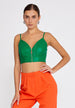 Verona Leather Crop Top Turn heads with the Verona  Leather Crop Top, a sultry, statement-making piece designed for the modern woman who embraces confidence and high fashion. Crafted from premium vegan leather, this emerald green bustier top features a sculpted V-neckline, contoured stitching, and a sleek gold zipper closure, delivering the perfect balance of edgy sophistication and contemporary allure.  The adjustable spaghetti straps ensure a tailored fit, while the structured silhouette enhances the figure, making it an ideal pairing for tailored trousers, high-waisted skirts, or leather pants. Whether styled for a night out, a fashion-forward daytime look, or an elevated street-style ensemble, the Verona Leather Crop Top brings effortless power and undeniable glamour to any outfit.  Key Features: •Premium Vegan Leather: A structured yet supple feel for a sleek, high-fashion finish. •Striking Emerald Green Tone: A vibrant, statement color that radiates confidence. •Gold Zip-Front Closure: Adds an elevated, designer-inspired touch. •Bustier Silhouette: Contoured stitching for a flattering, sculpted fit. •Adjustable Spaghetti Straps: Ensures comfort and a perfect fit. Recommended Accessories:  Jewelry: •Chunky Gold Hoop Earrings – A classic touch that enhances the bold aesthetic. •Stacked Bangles or Cuff Bracelet – To complement the gold hardware detail. •Minimalist Pendant Necklace – Keeps the focus on the structured neckline.  Handbag: •Sleek Black or Gold Mini Clutch – A refined accessory for a sophisticated edge. •Structured Crossbody Bag – Elevates the modern appeal of the look.  Shoes: •Metallic Strappy Heels – A chic pairing to match the gold zipper accent. •Pointed-Toe Pumps in Black or Nude – For a sleek, high-fashion look. •Bold Statement Sandals – In orange or cobalt blue for a daring color-block effect.  Hairstyle & Makeup: •Sleek High Ponytail or Slicked-Back Bun – Complements the structured, modern aesthetic. •Matte Red or Nude Lip – A bold, confident finish to elevate the entire look. The Verona  Leather Crop Top is designed for the trendsetter, the risk-taker, and the woman who commands attention. Made in Turkey.